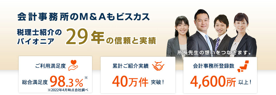 - ・1995年の創業以来、40万件の税理士紹介の中で培ったノウハウ・データから最適なマッチングを目指します。